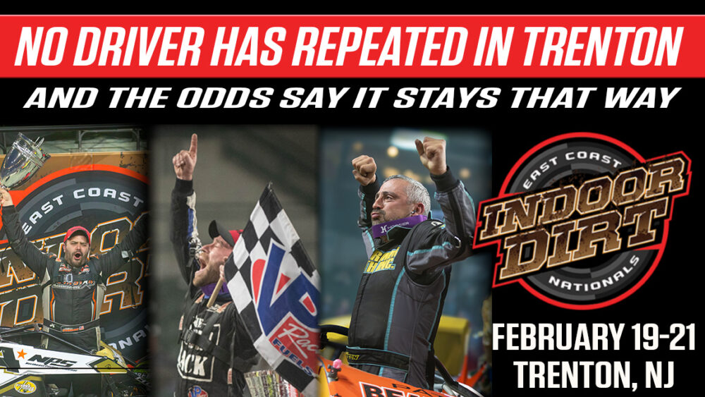 No Driver Has Repeated in Trenton — And the Odds Say It Stays That Way Trenton, N.J. – Six East Coast Indoor Dirt Nationals have been held inside Trenton’s CURE Insurance Arena, and there has yet to be a repeat Saturday night A-Main winner.Don’t look for a repeat visitor to victory lane Saturday, February 21, either. The odds simply are not in favor of it happening, with four former winners entered among a field of 95 drivers traveling to the event...